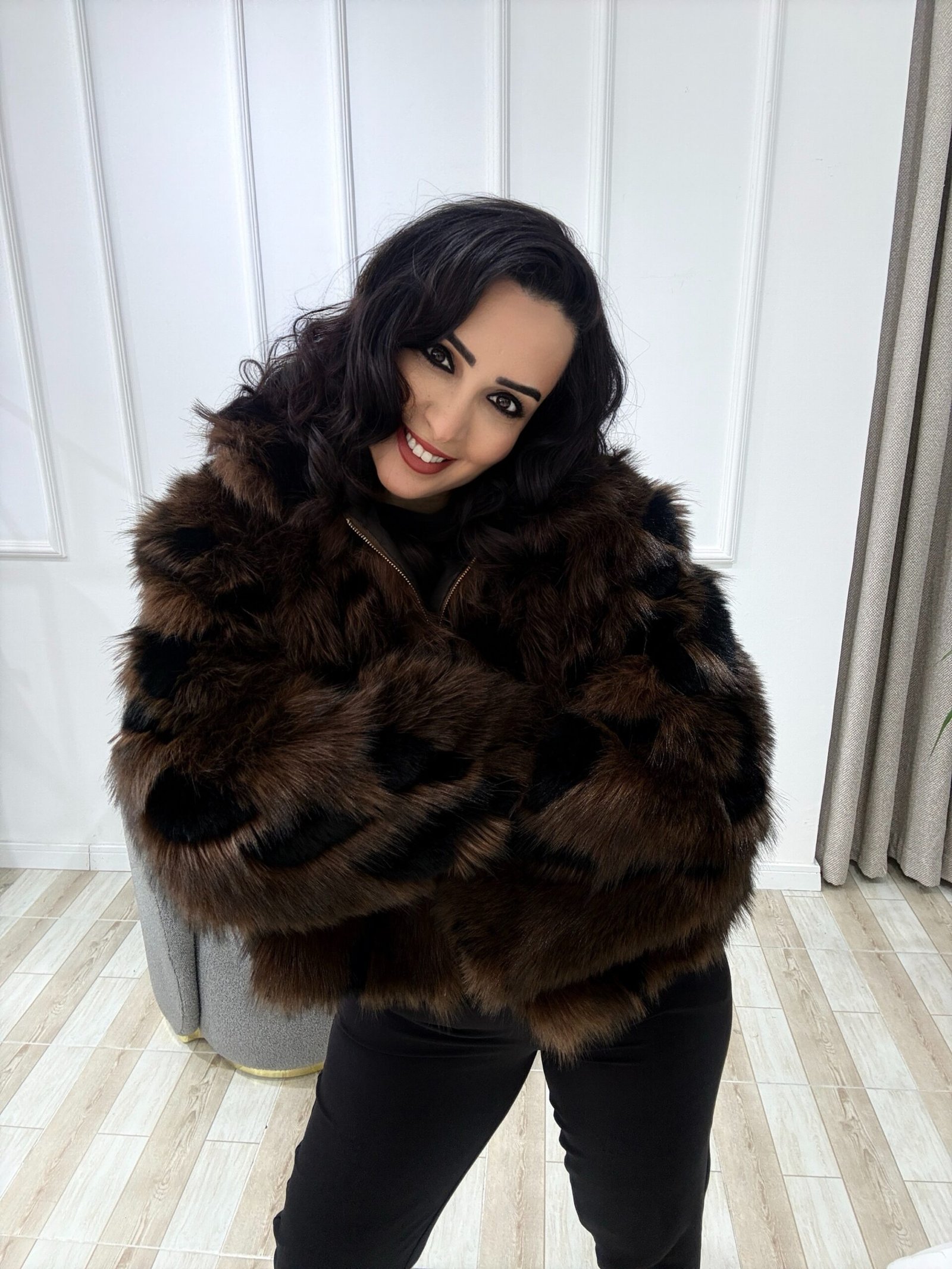 Kahve rengi yakası kürklü mont