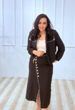 Vatkalı ekru şeritli bomber ceket önden yırtmaçlı düğme detaylı etek 2 li takım