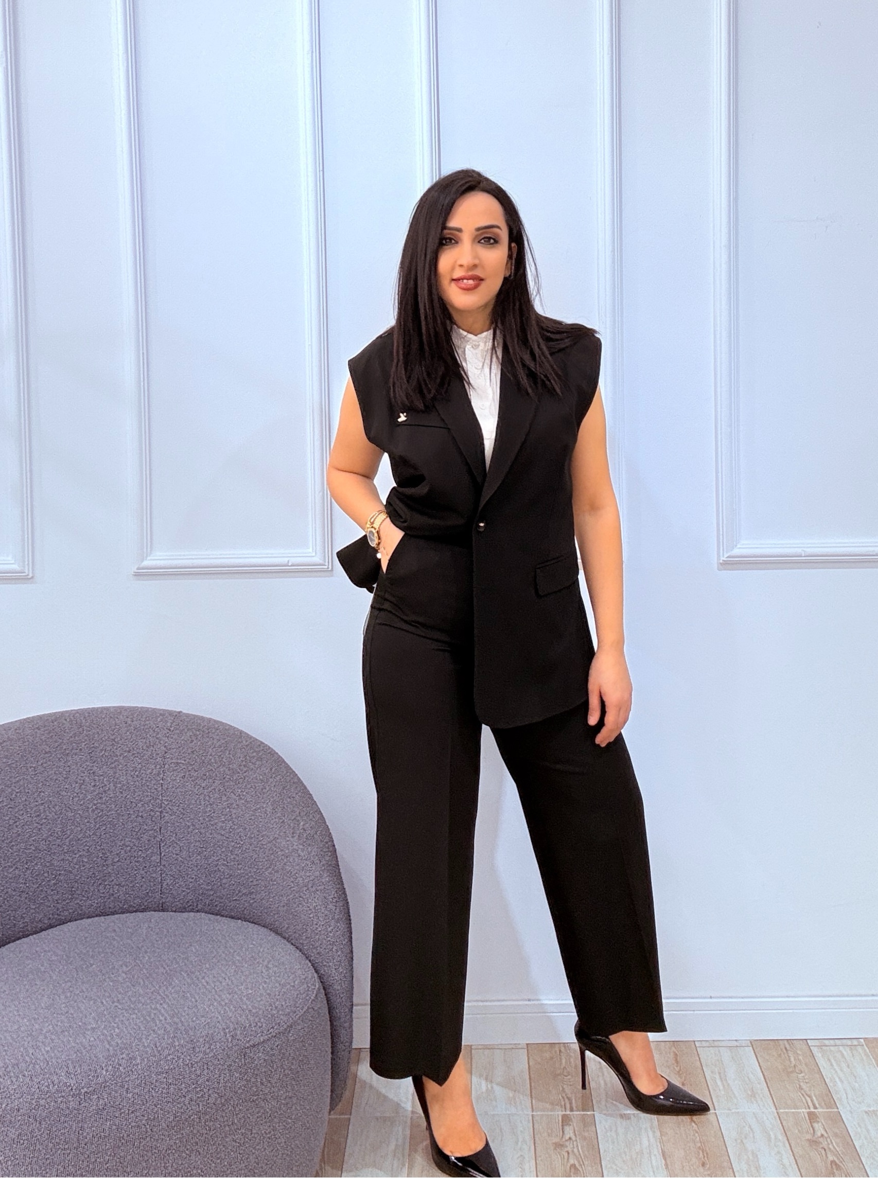 Yelekli kendinden hakim yaka gömlek detaylı siyah takım